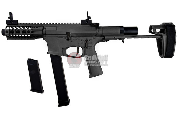 CURRENT STOCK: RESERVE ONLYFeatures: Pistol caliber carbine design. Collapsible pistol brace stock . Plugs and plays with other M45 designed accessories (unless specified otherwise). Good for approx 300fps. Comes with 1 150 round short magazine and 1 300 round long magazine...Qty in Cart: 0Price:Subtotal: -